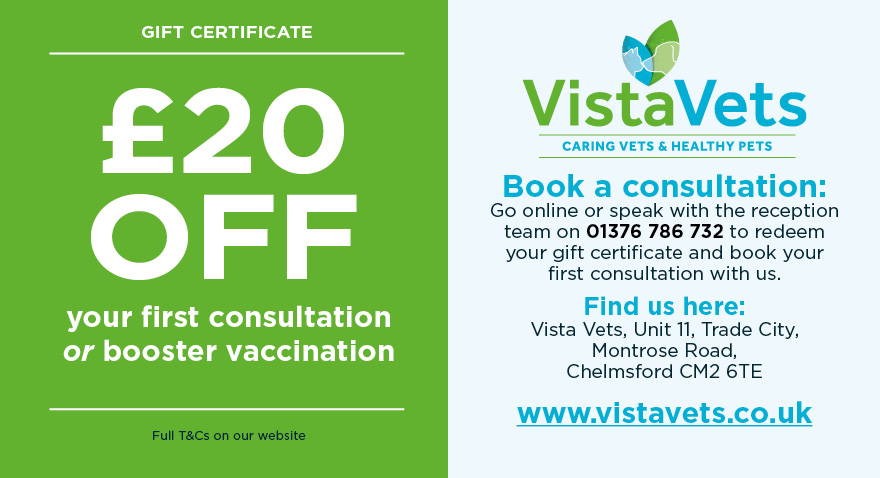 To welcome you to Vista Vets, we’d like to offer you a £20 gift certificate redeemable against your first consultation to welcome you to the practice.